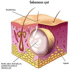 Sebaceous cysts are harmless, gradually forming bumps that usually lie beneath the surface of the skin. They form when sebaceous (oil) glands become blocked, trapping keratin and other materials inside a sac. These cysts are often found on the scalp, back, neck, and face, and can vary in size from a few millimeters to several centimeters.